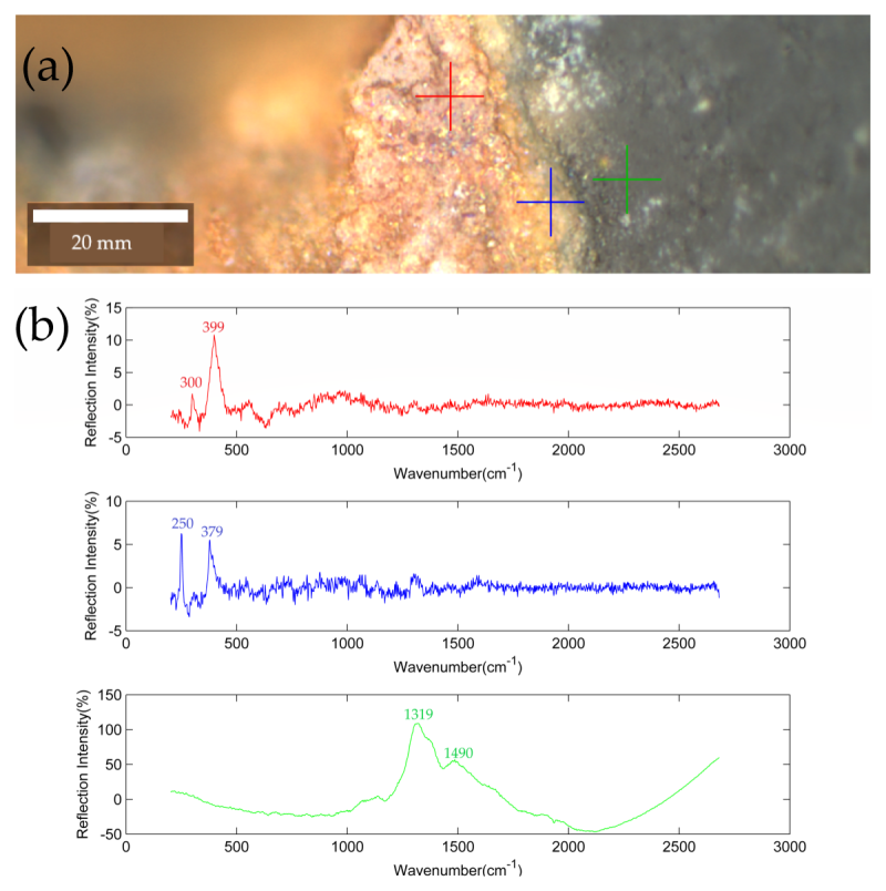 图2. 铁质病害的显微照片(a)和对应位置的拉曼光谱(b)